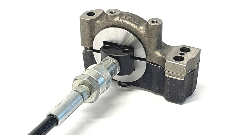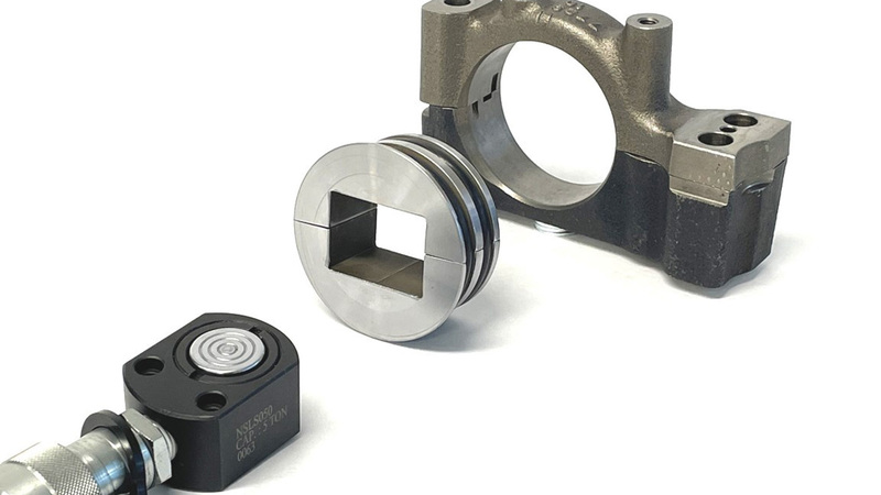 Vi tog en lågbyggd 5-tons cylinder och gjorde ett 2-delat verktyg som passade in i kundens detalj. Som drivkälla används en tryckluftsdriven hydraulpump. Cylinderns slaglängd är bara 6 mm men det räcker gott och väl för att ”överliggaren” ska lossna.